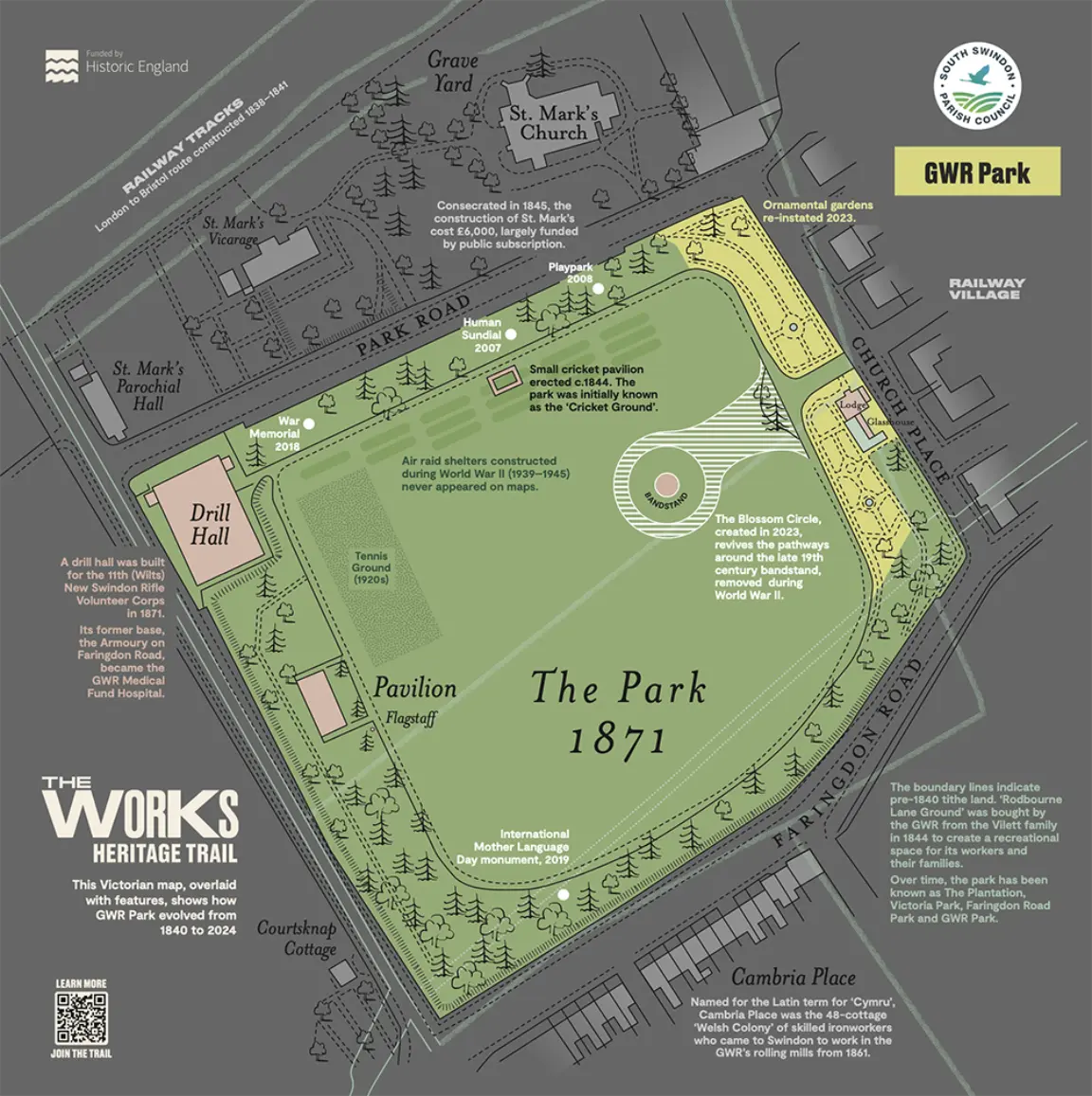 Created by tracing over a Victorian OS Map (black line art) and adding in shaded areas, colour, drawn elements and historical information to show the evolution of the park over time. See The Works Heritage Trail.