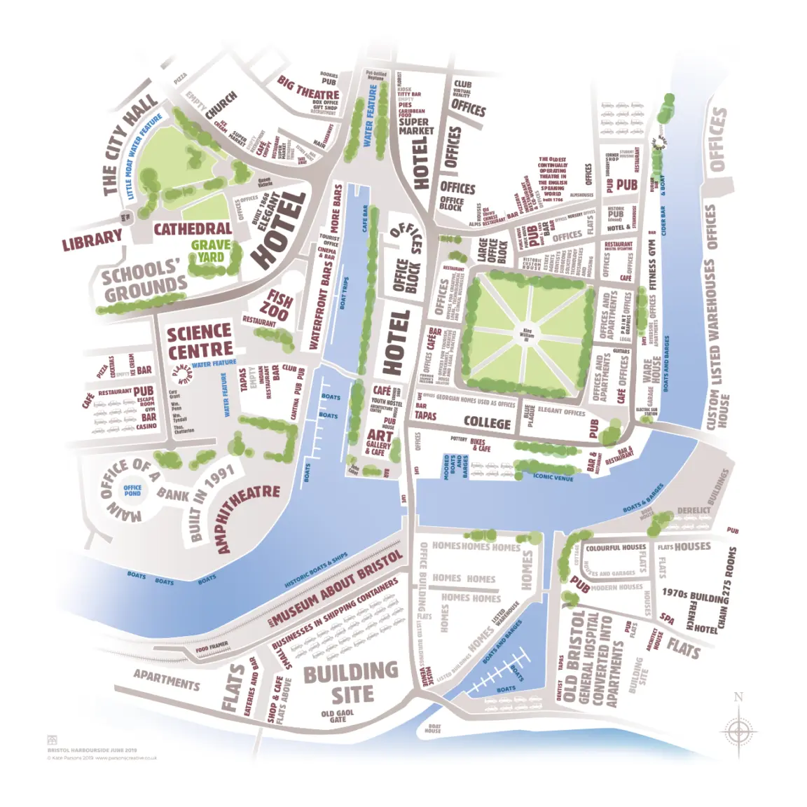 Map-making started as a personal project to 'spell out' what exists in areas of Swindon and Bristol. It has led to numerous commissions to create maps for cycle, culture and heritage trails, Heritage Open Days and civic placemaking.